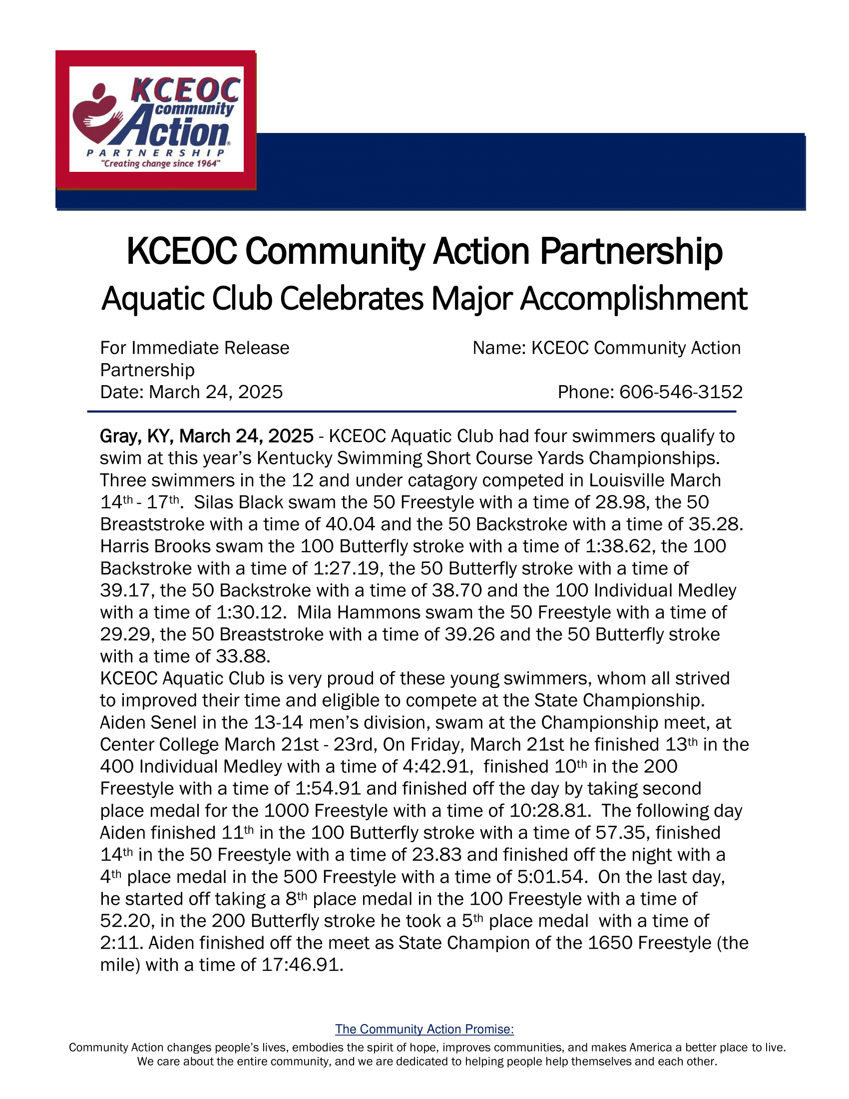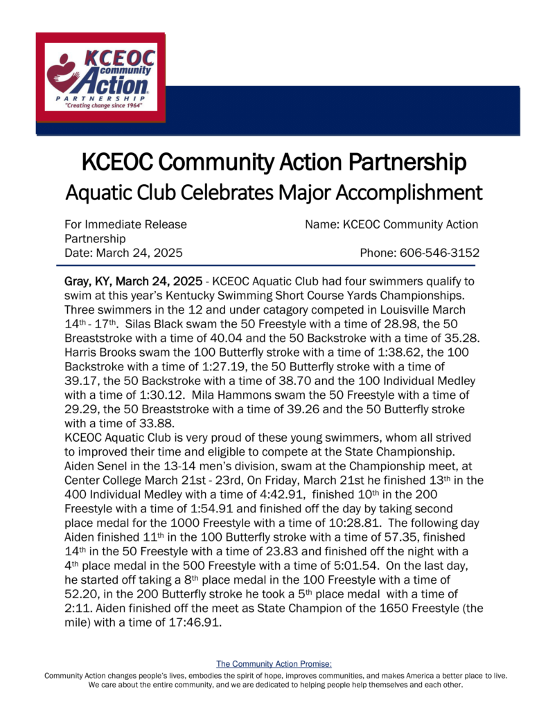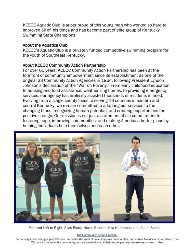 The KCEOC Community Action Partnership takes pride in these young athletes’ dedication and hard work. The KCEOC Aquatic Club is a privately funded competitive swimming program providing youth in Southeast Kentucky with opportunities to excel in the sport.