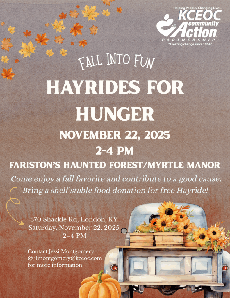 KCEOC Community Action Partnership invites you to celebrate the season at Hayrides for Hunger, a family-friendly fall event happening on Saturday, November 22, 2025, from 2–4 PM at Fariston’s Haunted Forest/Myrtle Manor in London, KY.