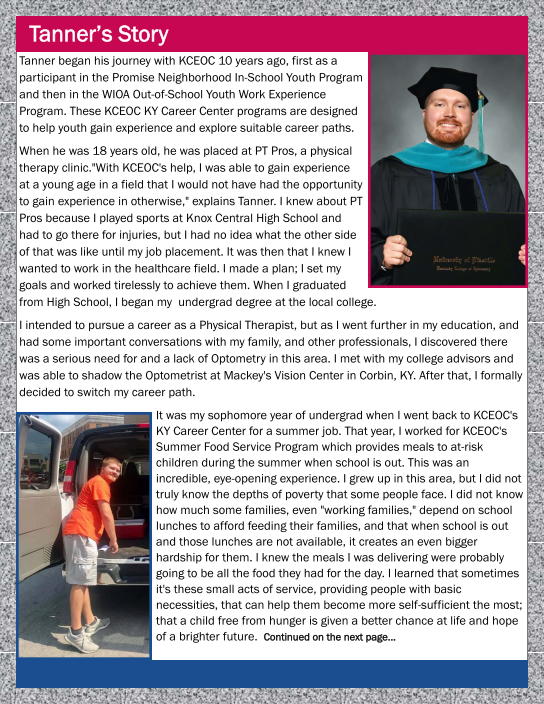 Tanner’s journey with KCEOC began more than ten years ago through the Promise Neighborhood In-School Youth Program and later through the WIOA Out-of-School Youth Work Experience Program. These opportunities, offered through the KCEOC KY Career Center, provided young people with the chance to explore careers and gain work experience.