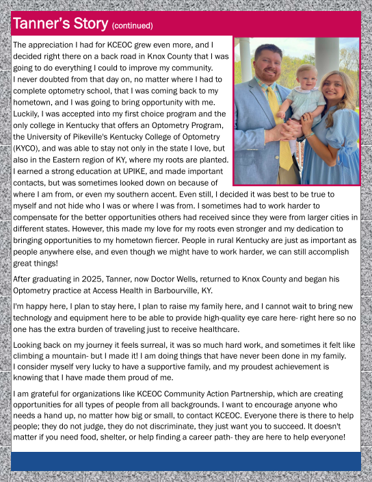 Though Tanner initially considered physical therapy, he soon realized it wasn’t the right fit. KCEOC helped him transition to shadowing an optometrist at Mackey’s Vision Center in Corbin, KY. That experience set him on a new path toward a future in optometry.
