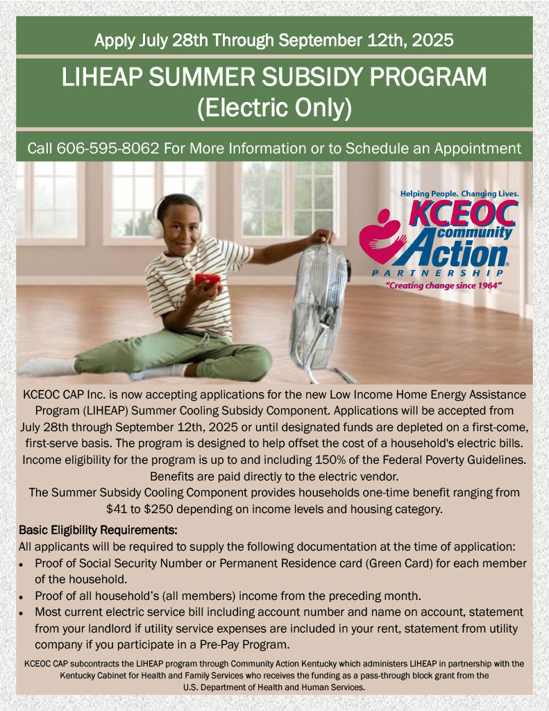 KCEOC Community Action Partnership is here to help our neighbors stay safe and cool this summer. We’ll be accepting applications for the Low Income Home Energy Assistance Program (LIHEAP) Summer Cooling Subsidy Component from July 28, 2025, through September 12, 2025.
